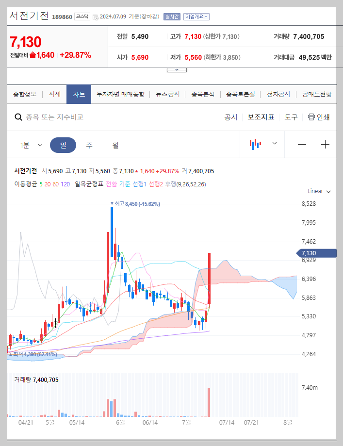 서전기전 전일 주가는 5,490원이며 전일 대비 1,640원 상승한 상한가에 모습을 보이고 있습니다. 서전기전의 주주현황을 살펴보면 홍춘근 주주가 전체 지분 43.74%를 소유하고 있습니다. 서전기전은 전기장비 기업으로 장중 기준으로 주가는 5,490원입니다. 서전기전의 시가 총액은 692억 원이며 발행 주식수는 9,698,780주입니다. 외국인 보유 비중은 2.19%이며 장중 거래량은 144,915원 을 기록했습니다. 매출액은 53억 원을 달성했습니다. EPS는 -386원이며 서전기전 주식 배당수익률은 %입니다.